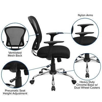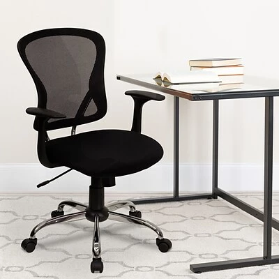 Complete your desk setup with this Flash Furniture mesh executive office chair. A sleek chrome base with rolling casters provides both stability and mobility, so you can wheel your way from the filing cabinet to the desk without standing. The mid-back design supports your body to relieve stress and strain, while the mesh construction keeps air circulating to help you stay cool. Featuring a padded upholstered seat, this chair is built for all-day comfort. Adjustable height, tilt and tension functions give you versatile ways to customize your seating experience, whether you want to recline or raise the seat. This Flash Furniture mesh executive office chair comes with fixed arms for added comfort.