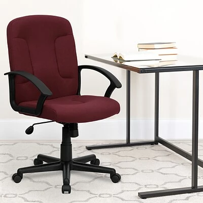 Enjoy comfort and style with this Flash Furniture mid-back fabric task and computer chair. This standard-style chair includes durable nylon arms and lovely burgundy fabric upholstery. It offers a tilt-lock mechanism, spring control, and pneumatic height adjustment to ensure customization and comfort. Perfect for smaller offices and cubicles, this chair is an excellent choice for everyday use.