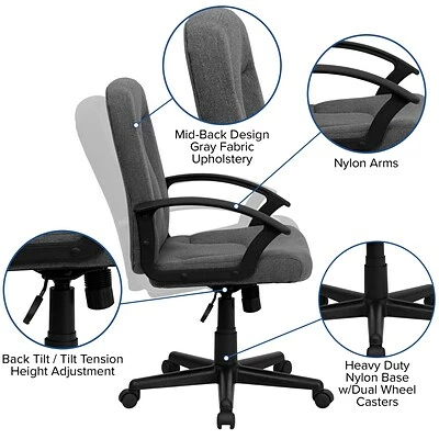 Contoured padding on the cushions of this Flash Furniture fabric computer chair provides comfort for long periods of sitting. Curved nylon arms ensure proper arm and shoulder positioning while adding durability against bumps and scrapes. Each Flash Furniture fabric task chair includes a heavy-duty nylon base that supports up to 250 pounds and gray fabric upholstery that ensures durability over repeated use. Casters with dual wheels let users move over most floor surfaces without exiting the chair.