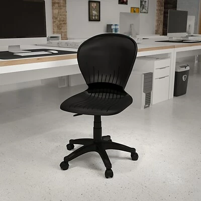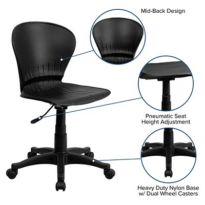 Increase productivity at your workplace with the black Flash Furniture Contemporary Task Chair that is ergonomically designed to provide comfort while working. Furnished with sturdy plastic seat and back, this Mid-back task chair is durable enough to withstand daily use. Its pneumatic seat height adjustment mechanism lets you alter the height of the seat as per your convenience to attain a comfortable posture. You can easily rotate this chair in all directions with its convenient swivel function.