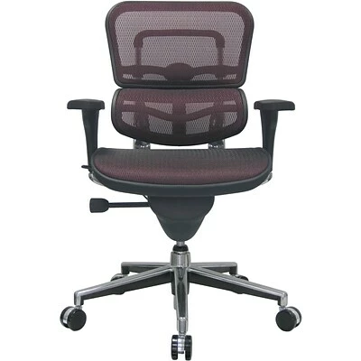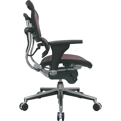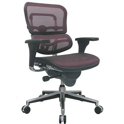 The Raynor Eurotech Ergo human mesh mid-back task chair provides the comfort you need for long days at work. This chair is customizable to suit the needs of your body, with adjustable arms, height, position, and lumbar support. You can even change the depth of the seat for greater relaxation. Its plum-red and mesh design ensures it will fit well in your home or office, making it an attractive complement to your office furniture.