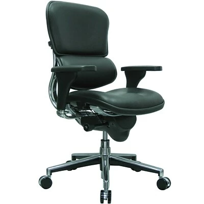 Give your back the support it needs with the Raynor Eurotech leather mid-back Ergohuman chair. With this innovative office chair, you can control the angle of the back with the three-position tilt-lock adjustment system. The pneumatic seat adjuster lets you find the right height for your desk or work table, and the adjustable padded arms give you more options. The black upholstery works great in any office setting.