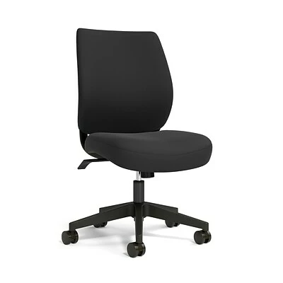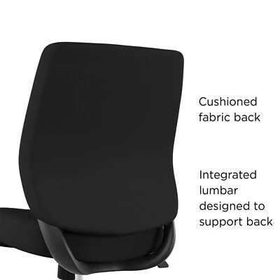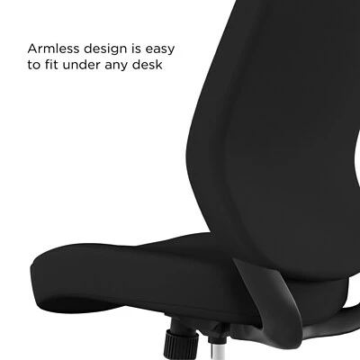 Get a sturdy seating solution for your office with this armless fabric chair. Five 360-degree caster wheels enable effortless movement around your work area, while the fabric upholstery offers durability and brings a clean look to your workstation. The armless design lets you optimize office space, and the contoured padded seat delivers plush comfort during long working hours. An adjustable seat height allows customization to suit different needs, while the included tilt knob easily supports a reclined position. This Essentials black fabric chair meets ANSI/BIFMA standards for reliable performance and safety, and the tilt lock feature lets you unlock or lock your chair in an upright position.