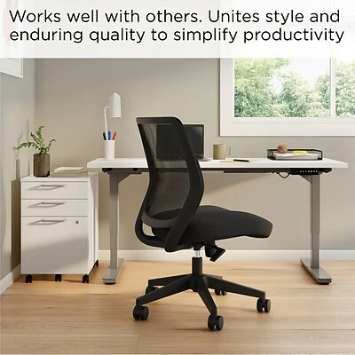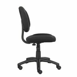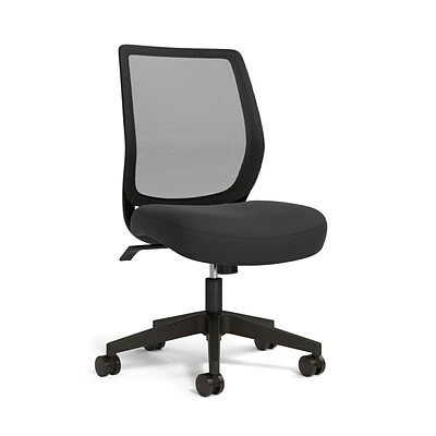 Set up an optimized ergonomic workstation with this armless mesh back fabric chair. The contoured seat and cushioned padding help absorb your weight and offer reliable support, while the mesh back promotes the flow of cooler air, releasing trapped heat. Calibrate the tilt resistance of the chair as you recline with the convenient tilt tension knob, and support proper posture with the adjustable seat height. An upright tilt lock lets you enable and disable the recline function easily, while the armless design means you can slide this seat under your desk to maximize office space. The five casters on this Essentials black mesh back fabric chair support effortless mobility throughout your office.